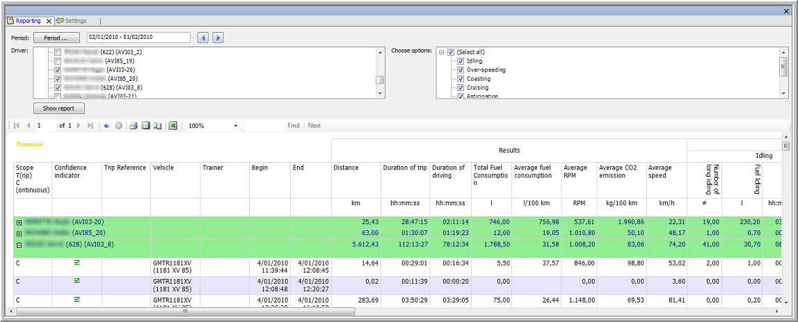 Zielona linia w raporcie zawiera sumę wszystkich wartości odnoszących się do danego kierowcy, z pominięciem pól pokazujących średnie wartości (Średnia prędkość, Średnie zużycie paliwa). Dla tych pól obliczana jest średnia ważona. Do obliczania tych wartości używa się wyłącznie wartości z zielonym wskaźnikiem prawdziwości.