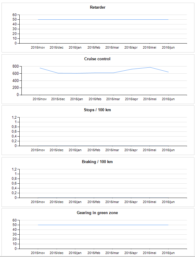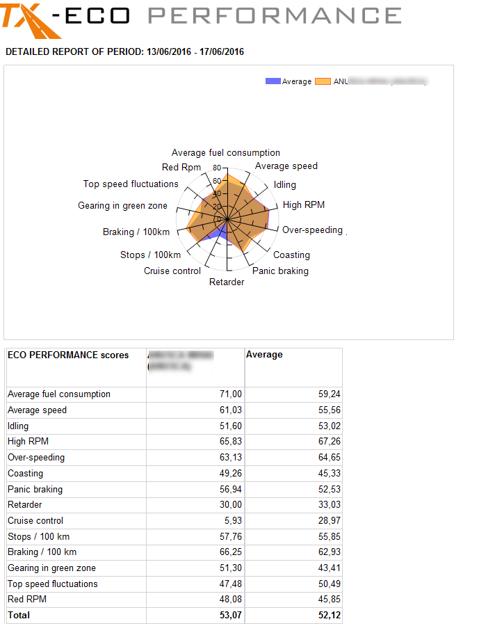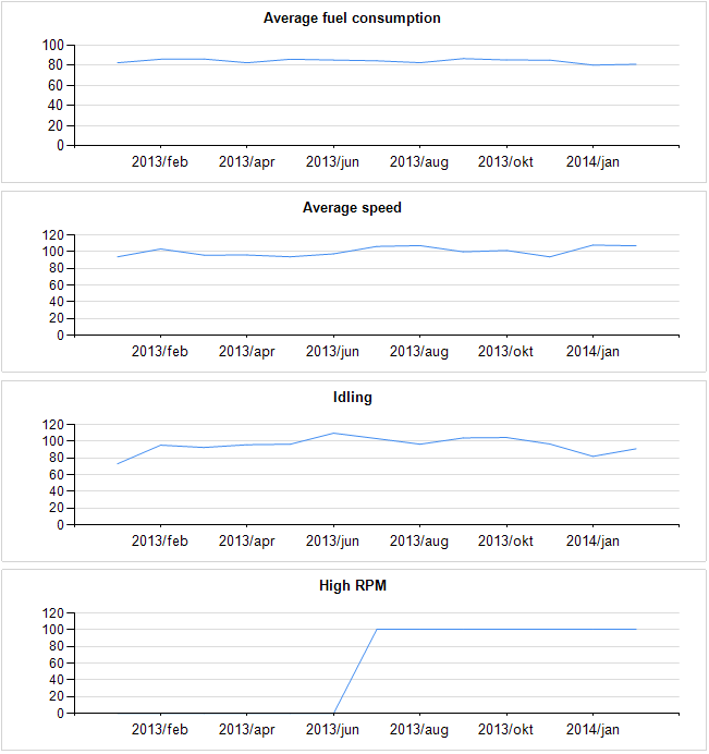 Raport zawiera wykres radarowy ukazujący tendencje i rozwój w porównaniu ze średnią floty, a także wykres liniowy dla poszczególnych parametrów jazdy.