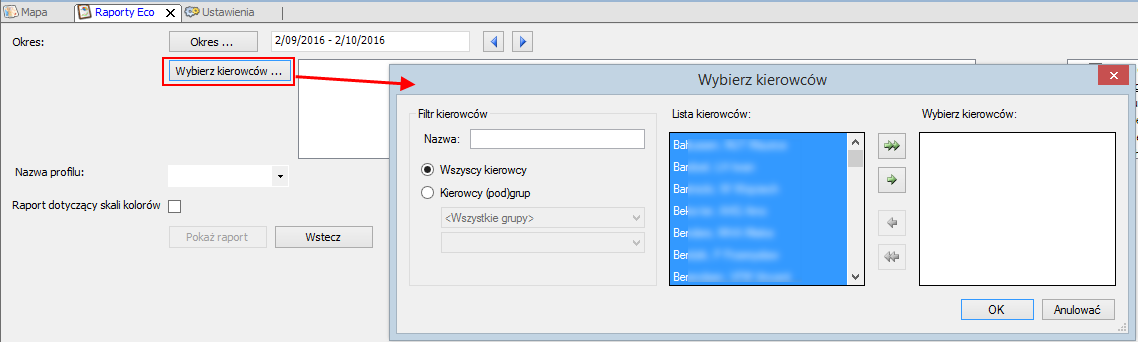 Dane w raporcie zostaną oznaczone kolorami w 10-kolorowej skali. Po kliknięciu na nazwę kierowcy po lewej stronie zostanie wygenerowany szczegółowy raport (zob. Szczegółowy raport poniżej).