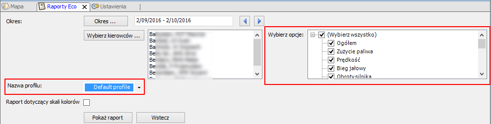W tym raporcie wyniki są obliczane dla każdego kierowcy w oparciu o dane z funkcji ECO MONITOR.