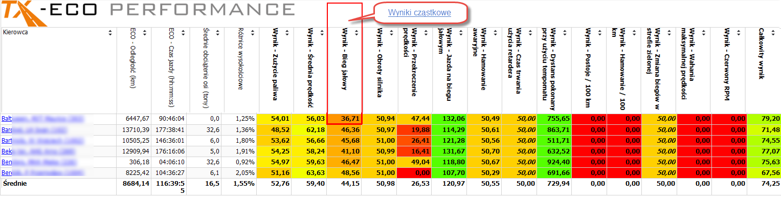 Raport TX-ECO WYDAJNOŚĆ zawiera kartę wyników wybranych wskaźników stylów jazdy dla wybranych kierowców. Wszystkie wyniki cząstkowe wykorzystują parametry zdefiniowane w wybranym profilu.