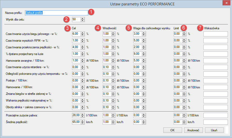 Uwaga: Dla większości wyników cząstkowych celem jest zachowanie jak najniższego wyniku, jednak w przypadku niektórych parametrów celem jest osiągnięcie wyższego wyniku cząstkowego, np. „Średnia prędkość”, „Jazda na luzie”, „Odległość pokonana przy użyciu tempomatu”. W tych przypadkach powyższa formuła jest nieco inna: Wynik cząstkowy = Wynik dla Celu - (Docelowy wynik cząstkowy - Rzeczywista wartość) / Wrażliwość) |