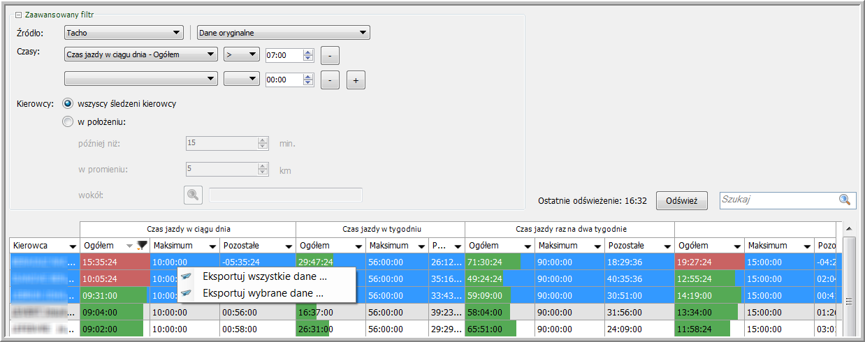 Kolor komórki zmienia się na czerwony, w momencie gdy kierowca przekroczy dozwolony czas jazdy.
