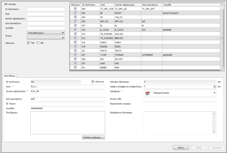 Swoimi naczepami można zarządzać w module Ustawienia > Zarządzanie > Naczepy. Tutaj można dodawać nowe naczepy i modyfikować istniejące.