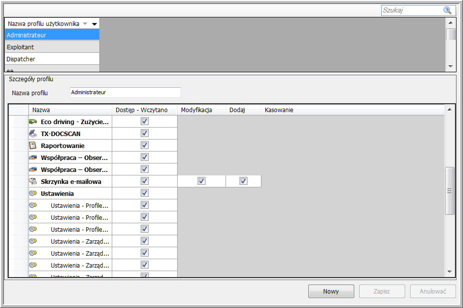 Firma transportowa może przypisać profil użytkownikowi jej własnej floty. Taki profil można utworzyć w module Ustawienia > Profile > Profile uprawnień. W tym miejscu można przypisać do profilu określone uprawnienia, zaznaczając pola wyboru na dostępnej liście. Utworzony profil można później przydzielić użytkownikowi w module Ustawienia > Zarządzanie > Personel.