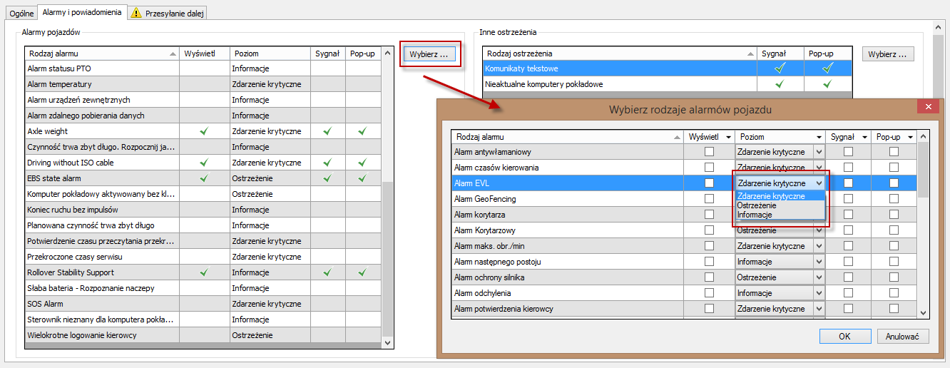 Użytkownicy mogą również definiować poziomy alarmów na poziomie rodzaju alarmu: Zdarzenie krytyczne, Ostrzeżenie lub Informacje.