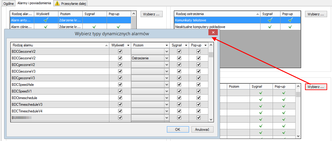 Aby zmodyfikować tę konfigurację, kliknij przycisk Wybierz. Umożliwia to określenie, przy których dynamicznych alarmach ma być emitowany sygnał dźwiękowy lub ma być wyświetlane okienko wyskakujące. Te okna zawierają przegląd aktualnej konfiguracji.