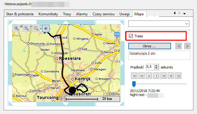Na karcie Mapa można wyświetlić historię położenia wybranego pojazdu / naczepy.