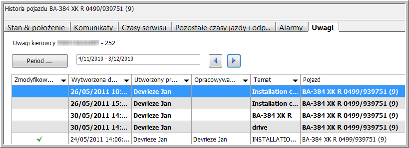Ta zakładka zawiera uwagi dodane w zakładkach „Status i położenie” i „Czasy serwisu”.