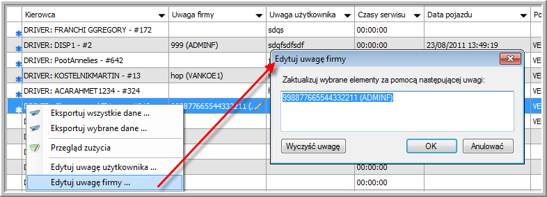 Podczas wybierania wiersza w polach edytowalnych pojawi się ikona ołówka. Kliknij w obszarze pola, aby pojawił się kursor. W module „Obserwacja pojazdu” można dodać uwagę dla kilku pojazdów jednocześnie. Aby to zrobić, zaznacz wybrane wiersze i kliknij Edytuj uwagę użytkownika ... lub Edytuj uwagę firmy ...