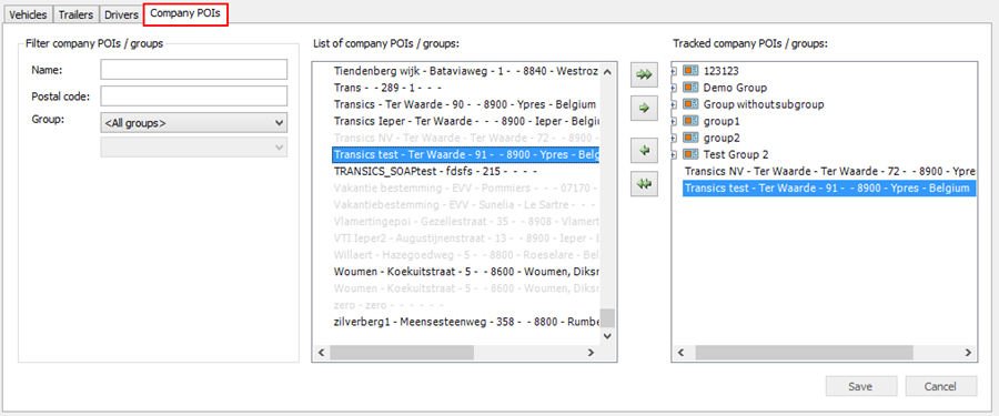 Następnie przejdź do pozycji Ustawienia > Śledzenie > Kto śledzi co, aby przypisać punkt POI do użytkownika (patrz Kto śledzi co). Wybierz odpowiedniego użytkownika w górnej części i naciśnij kartę Punkty POI firmy na dole. Za pomocą przycisków strzałek przenoś pozycje pomiędzy listę lewą (= wszystkie pozycje) a prawą (= śledzone pozycje).