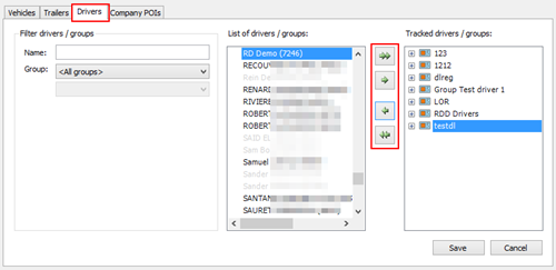 Następnie przejdź do pozycji Ustawienia > Śledzenie > Kto śledzi co, aby przypisać kierowcę do użytkownika (patrz Kto śledzi co). Wybierz odpowiedniego użytkownika w górnej części i naciśnij kartę Kierowcy na dole. Za pomocą przycisków strzałek przenoś pozycje pomiędzy listę lewą (= wszystkie pozycje) a prawą (= śledzone pozycje).