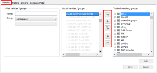 Następnie przejdź do pozycji Ustawienia > Śledzenie > Kto śledzi co, aby przypisać pojazd do użytkownika (patrz Kto śledzi co). Wybierz odpowiedniego użytkownika w górnej części i naciśnij kartę Pojazdy na dole. Za pomocą przycisków strzałek przenoś pozycje pomiędzy listą lewą (= wszystkie pozycje) a prawą (= tylko śledzone pozycje).
