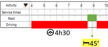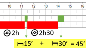 Jak długie przerwy muszę robić?Przerwa 45'Po 4 godz. 30 min jazdy obowiązkowa jest 45-minutowa przerwa. 45-minutową przerwę można podzielić na pierwszą przerwę o długości 15 min i drugą przerwę o długości 30 min (taka kolejność jest wymagana: 15' + 30' (nie 30' + 15') (cf. Czas jazdy 4 godz. 30 min).