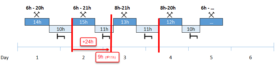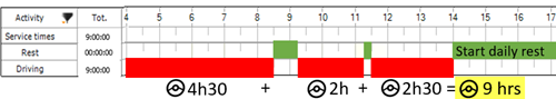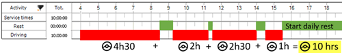 Kierowca może również zdecydować o skróconym czasie dziennego odpoczynku o długości 9 godzin (ale mniej niż 11 godzin). Jednak jest to możliwe jedynie 3 razy pomiędzy dwoma tygodniowymi czasami odpoczynku. Ważna uwaga: Przykład (patrz obraz osi czasu poniżej)Przykład: Gdy kierowca zaczyna prowadzić o godz. 6:00 w 1. dniu, musi zrealizować dzienny czas odpoczynku (standardowy (11 godz.), skrócony (9 godz.) lub podzielony (3 + 9 godz.)) najpóźniej do godz. 6:00 dnia 2.