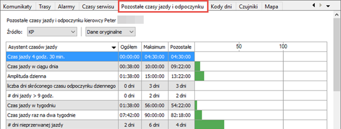 Czasy jazdy i odpoczynku w systemie TX-CONNECT można znaleźć w określonej zakładce w dolnej części (Historia) modułów Obserwacja kierowcy oraz Obserwacja pojazdu.