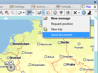 Używając opcji Wyślij dokument w module Obserwacja pojazdu / Mapa, dyspozytorzy mogą wysyłać dokumenty do komputerów pokładowych.