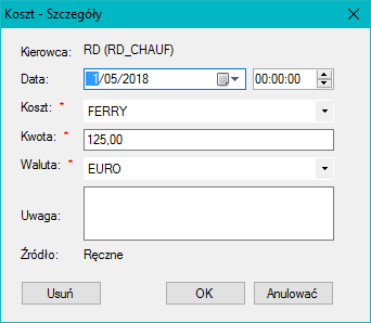 Wybierz typ kosztów, kwotę i właściwą walutę. |