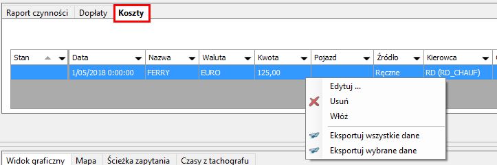 Kliknij koszt prawym przyciskiem myszy i kliknij przycisk Usuń aby go usunąć. Usunięty koszt zostanie najpierw przekreślony, jak pokazano na zrzucie ekranu. Kliknij przycisk Zapisz aby zapisać wprowadzone zmiany i usunąć koszty z przeglądu. |
