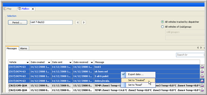 W module „Obserwacja Pojazdu” i „Skrzynka e-mailowa”, mozesz zaznaczyc kilka alarmów i/lub wiadomosci, a nastepnie oznaczyc je jako zmodyfikowane lub przeczytane.