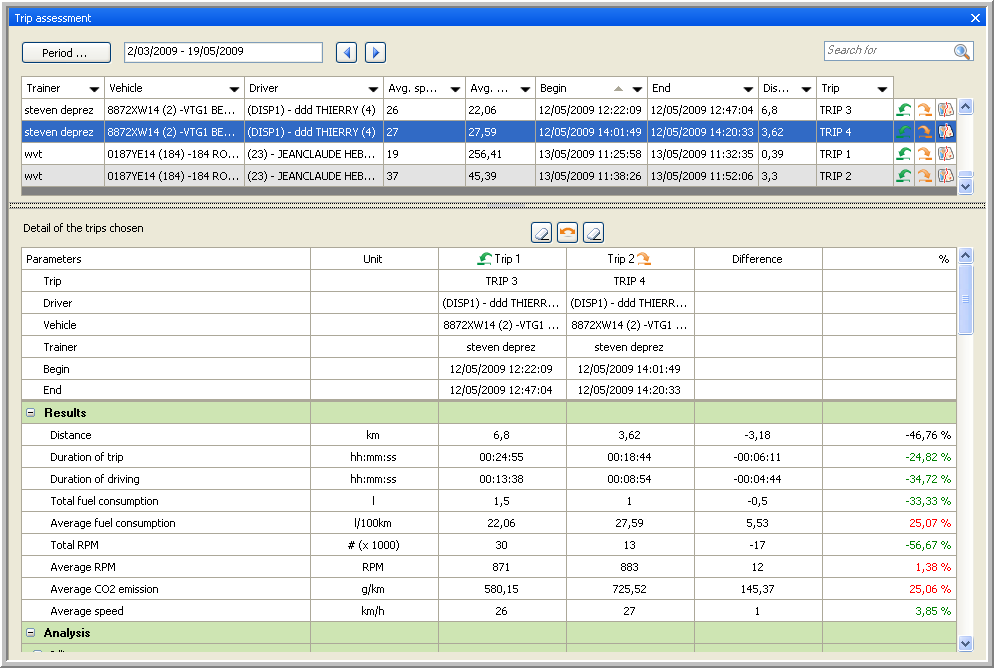 Na tym ekranie można sprawdzić szczegółowe informacje na temat tras szkoleniowych swoich kierowców, porównać je i zapisać wyniki w postaci pliku Excel lub PDF.