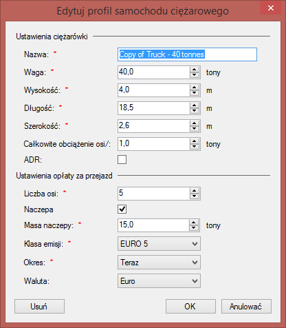 Ustawienia ciężarówki (Parametry przeliczenie trasy) |