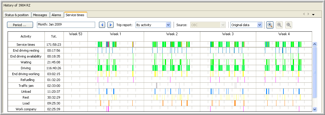 This tab page is a graphical display of the service times the driver performed during the selected day, week, or month, or since his latest 8-hour period of rest. You can have an overview by activity, by work code or the totals.