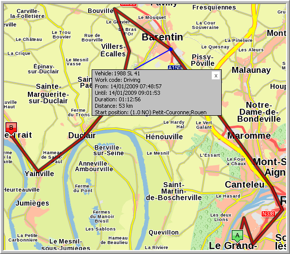 The map will automatically open displaying the position / route in the same colour as the activity. A box shows you the corresponding vehicle, the activity, the begin and end time of the activity, the duration of the activity and, in case of the activity "Driving", the distance that was covered.