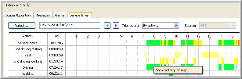 To view the position of a vehicle during an activity or the route the driver has travelled on map, right-click on the specific activity block and select "Show activity on map".