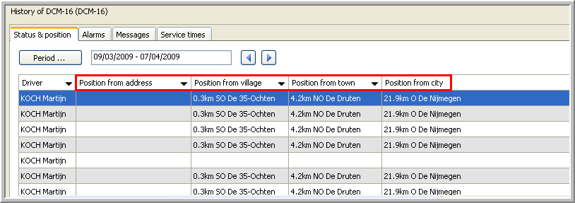 In the "Vehicle follow-up" window you can consult 4 different types of position information for the followed vehicles: "Position from address" / "Position from village" / "Position from town" / "Position from city". You can see these columns both in the Real-time information grid as in the History information Status & position and Alarms tab page.