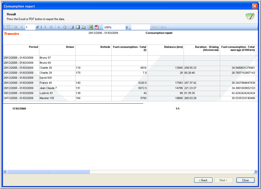 You can generate a consumption overview for one or more driver(s) based on the information captured from CAN Bus and save it as an Excel or PDF document.