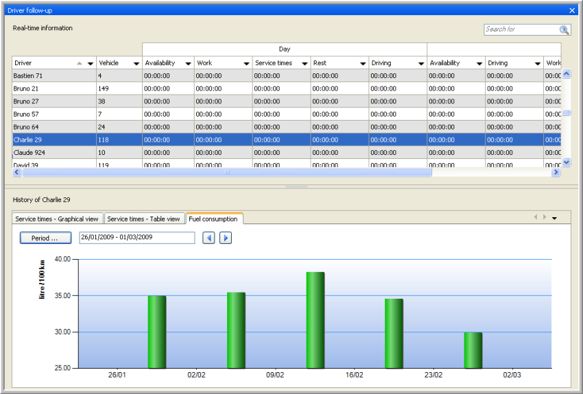 You can consult a graphical overview of the average fuel consumption (per week) for the driver selected in the Real-time information part of the "Driver follow-up" screen.