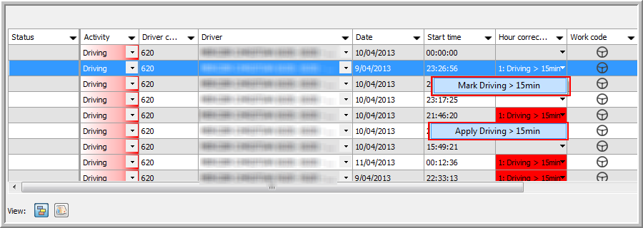 Remarque : Correction d'heure attribuée à un chauffeur / à un groupe : À partir de la version 11.35 de TX-CONNECT, vous pouvez attribuer des corrections d'heure à des (groupes de) chauffeurs spécifiques (voir l'onglet Chauffeurs dans « Paramètres » > « Gestion » > « Corrections d'heure »). Par conséquent, seules les corrections d'heure attribuées aux chauffeurs / aux groupes sélectionnés seront prises en compte.