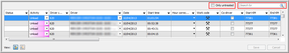 Cette table contient un tableau d'information détaillé pour votre sélection dans la zone de recherche. Cette partie de l'écran Gestion des activités contient un filtre période et un champ de recherche. De plus, vous pouvez visualiser seule l'information non traitée en cochant l'option.