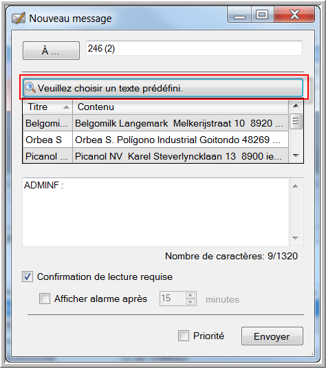 Vous pouvez créer des messages prédéfinis dans le menu "Gestion" des "Paramètres". Ces messages peuvent être utilisés lorsque vous envoyez un nouveau message à partir de Suivi véhicules ou de la Messagerie.