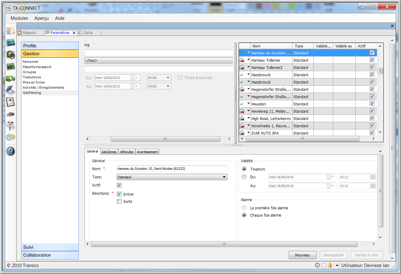 En général, GeoFencing veut dire que le système Transics vous avertit lorsqu’un certain véhicule entre dans / sort d’une certaine zone autour d’une position géographique, par exemple un POI, le site d’un client ou d’un fournisseur. Vous pouvez créer cet objet GeoFencing vous-même dans le module Paramètres > Gestion > GeoFencing ou depuis la carte.