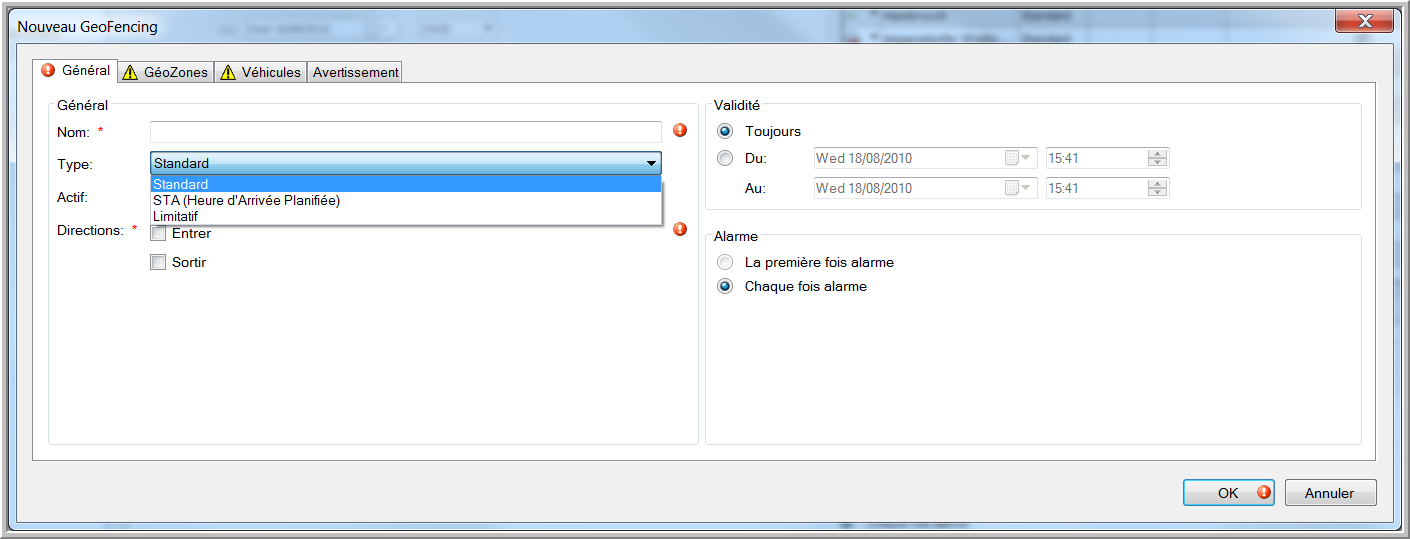 STA veut dire que le chauffeur et / ou la base reçoivent une alerte lorsque le véhicule n’est pas entre dans cette zone dans le délai prévu.