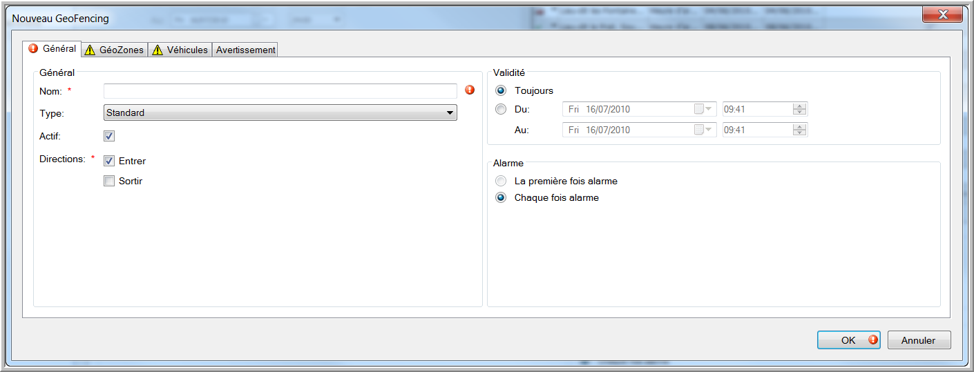 GeoFencing Standard veut dire que le chauffeur et / ou la base reçoivent une alerte lorsque le véhicule entre dans / sort d’une certaine zone.