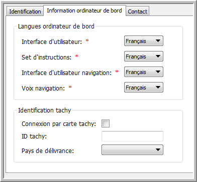 Cet onglet contient de l'information sur les langues utilisées sur l'ordinateur de bord et les paramètres d'identification du tachygraphe.