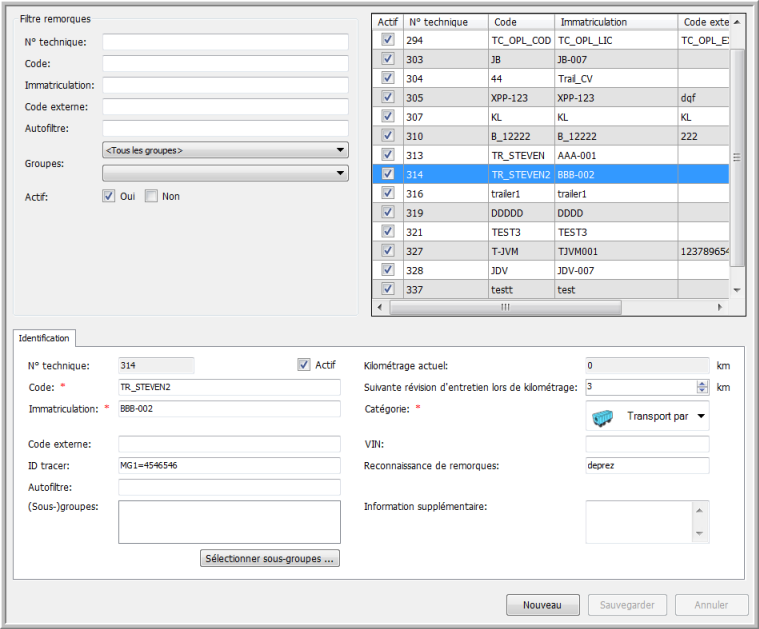 La partie inférieure contient l'onglet Identification avec de l'information détaillée sur la remorque sélectionnée.