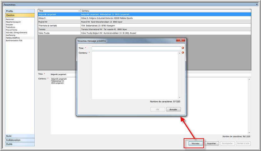 Vous pouvez créer des messages prédéfinis dans le menu "Gestion" des "Paramètres". Ces messages peuvent être utilisés lorsque vous envoyez un nouveau message à partir de Suivi véhicules ou de la Messagerie.