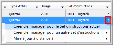 Dans "Aperçu OdB", vous pouvez créer une clef manager pour un set d'instructions spécifique et actualiser le set d'instructions à distance. Sélectionnez un OdB dans "Aperçu OdB", cherchez la colonne "Set d'instructions" et cliquez sur la flèche pour ouvrir la liste déroulante.