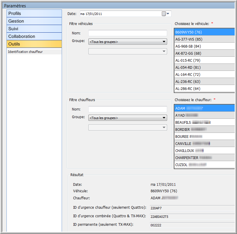 Pour la création des codes, choisissez un véhicule et/ou un chauffeur et une date.