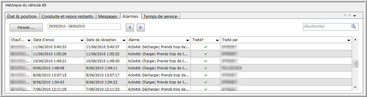 Cet onglet est un aperçu de toutes les alarmes qui sont signalées par l'ordinateur de bord du véhicule sélectionné dans la partie Information en temps réel.