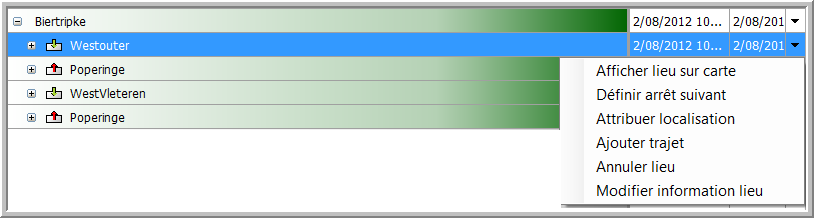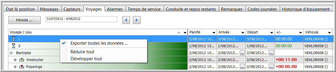 L'onglet Voyages contient un aperçu des voyages et des lieux, qui sont attribués au véhicule sélectionné pendant la période définie.