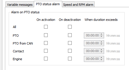 Cet onglet vous permet de définir quand une alarme d'état PTO doit être donnée.