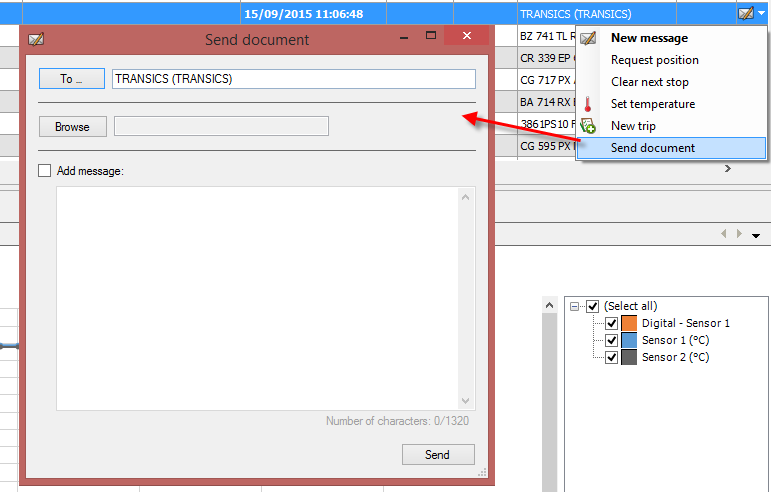 Via l'option Envoyer document dans le module Suivi véhicules / Carte, l'exploitant peut envoyer des documents aux ordinateurs de bord.