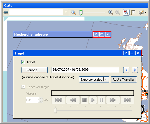 Les fenêtres suivantes peuvent être réduites / agrandies: "Rechercher adresse", "Trajet véhicule", "Position géo", "Filtrer sur la carte" et "Calcul du trajet".