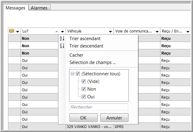 Dans "Suivi chauffeurs" et "Messagerie", il y a une nouvelle colonne, par laquelle vous pouvez filtrer les messages lus / non lus. Si le champ est vide, l'état du message lu / non lu ne s'applique pas à ce message.