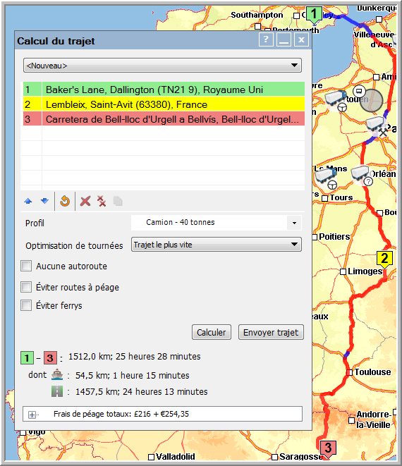 Pour un calcul plus précis du trajet et des frais de péage, vous pouvez créer des profils de camion individuels, en tenant compte des paramètres de camion et de péage. Veuillez noter que les frais de péage sont liés au profil de camion choisi.